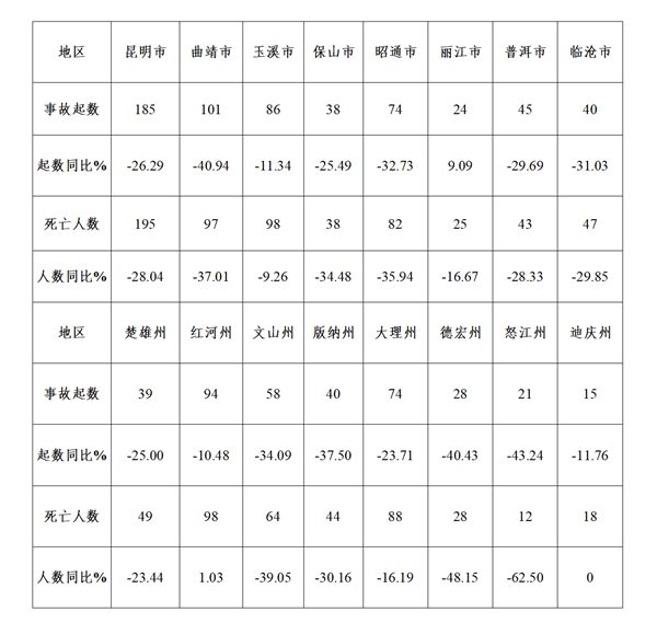 1-11月份,9個州市發(fā)生較大事故:大理州4起、死亡13人,同比增加2起、6人;曲靖市3起、死亡14人,同比增加1起、7人;楚雄州2起、死亡7人,同比起數(shù)持平、死亡人數(shù)減少1人;紅河州2起、死亡7人,同比增加1起、2人;文山州2起、死亡6人,同比減少3起、11人;玉溪市1起、死亡6人,同比起數(shù)持平、死亡人數(shù)增加1人;昭通市1起、死亡4人,同比減少3起、8人;臨滄市1起、死亡6人,同比起數(shù)持平、死亡人數(shù)增加2人;迪慶州1起、死亡4人,同比增加1起、4人。各州市事故總體情況詳見下表: