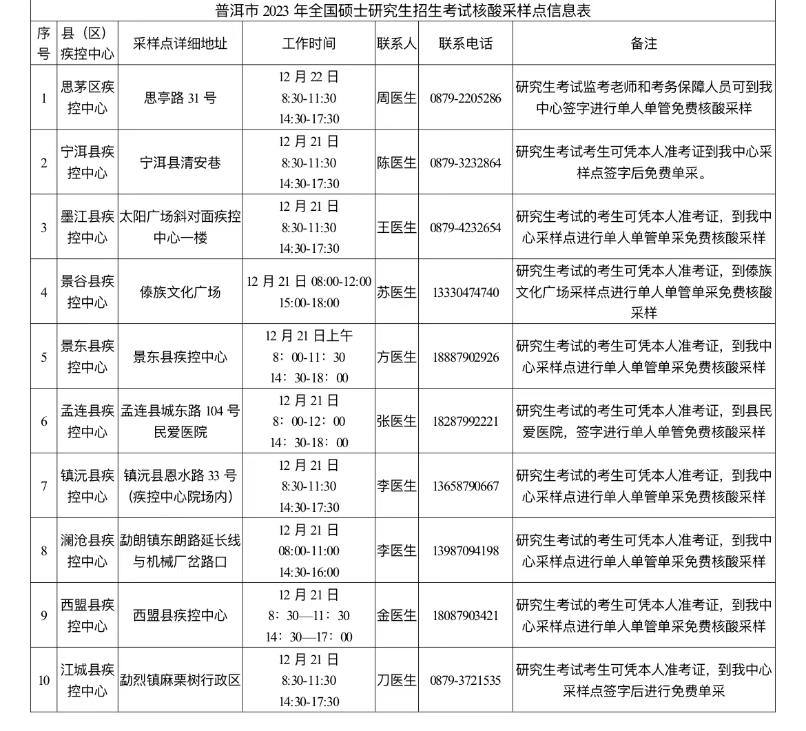 一、除在之前發(fā)布的《普洱市2023年全國碩士研究生招生考試考生告知書》中明確的核酸檢測點(diǎn)外,普洱市十縣區(qū)疾控中心也作為本次研考組考的定點(diǎn)檢測機(jī)構(gòu),于12月21日面向研考考生提供單人單管單采免費(fèi)核酸采樣服務(wù)。十縣區(qū)核酸采樣點(diǎn)詳細(xì)信息及工作時(shí)間詳見附件(注:思茅區(qū)疾控中心僅為研究生考試監(jiān)考教師和考務(wù)保障人員提供核酸采樣服務(wù))。