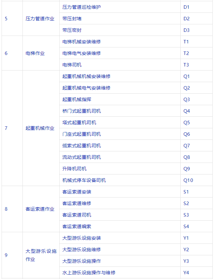 特種設備安全管理人員、叉車司機、起重機司機、起重機指揮、壓力容器、鍋爐、氣瓶充裝、電梯安裝與維修、觀光車、客運索道操作與修理、大型游樂設施操作與維修等等。