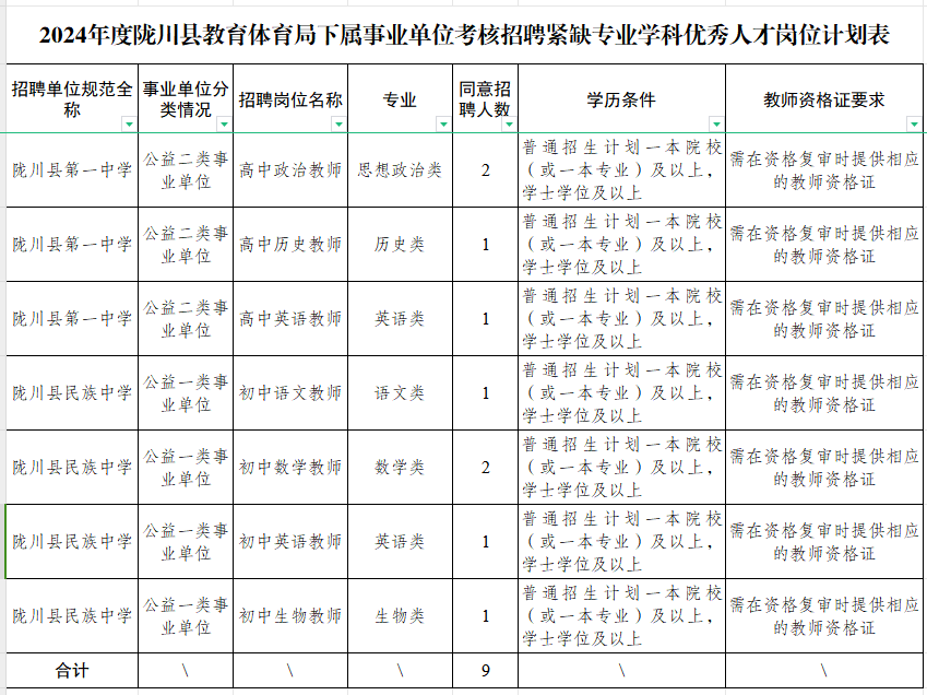 根據(jù)《關(guān)于同意縣教育體育局黨組使用編制通知單》(隴機(jī)編辦準(zhǔn)[2023]4號(hào))及《隴川縣人力資源和社會(huì)保障局關(guān)于印發(fā)2024年教育衛(wèi)生部門(mén)考核招聘緊缺專業(yè)學(xué)科優(yōu)秀人才工作方案的通知》隴人社發(fā)〔2024〕2號(hào)文件精神,2024年隴川縣教體系統(tǒng)考核招聘緊缺專業(yè)學(xué)科優(yōu)秀人才9名,其中:隴川縣第一中學(xué)4名、隴川縣民族中學(xué)5名,F(xiàn)將有關(guān)事宜公告如下: