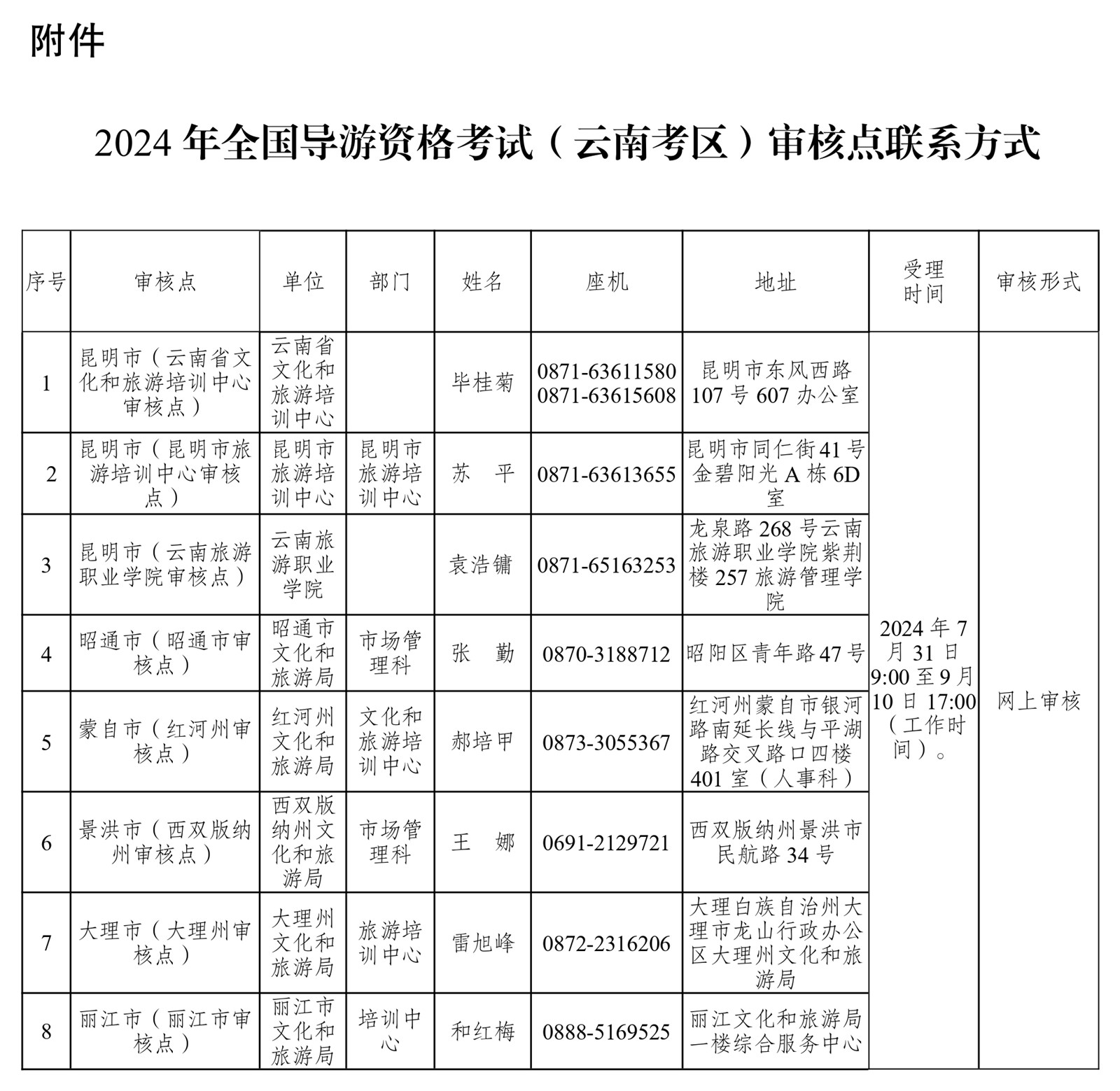 附件:2024年全國導游資格考試(云南考區(qū))審核點聯(lián)系方式