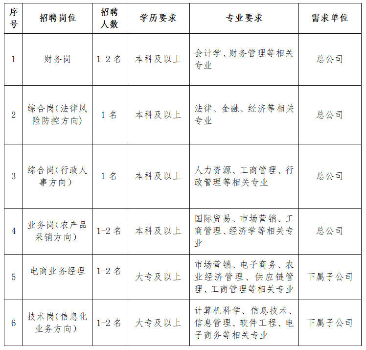 現(xiàn)結合公司發(fā)展需求,計劃面向社會公開招聘財務、法務、行政、業(yè)務采銷、電商運營、信息化技術崗位人才。
