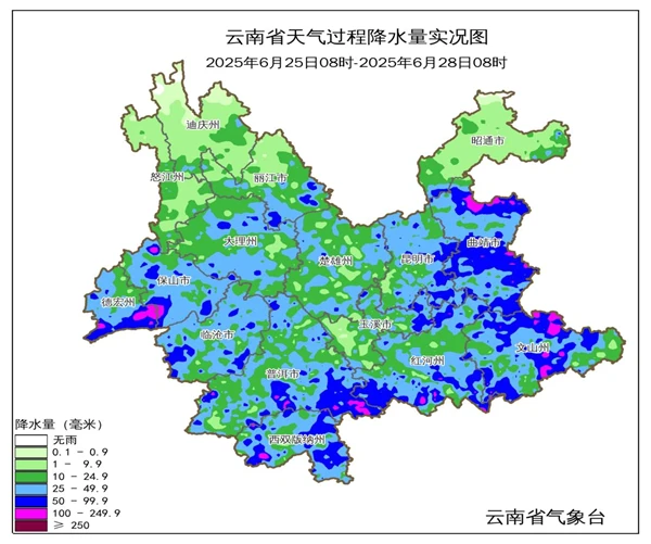 6月27日,我省中東部、南部、西部邊緣發(fā)生的強降雨過程結(jié)束,過程平均雨量32.6毫米,最大小時雨量91.9毫米,出現(xiàn)在普洱市思茅區(qū)六順鎮(zhèn)南邦河站。