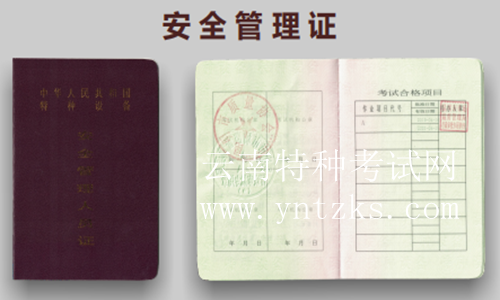 鍋爐、壓力容器、電梯、起重機(jī)械、客運(yùn)索道、場(chǎng)(廠)內(nèi)專用機(jī)動(dòng)車輛的管理人員統(tǒng) 稱為特種設(shè)備安全管理人員,代號(hào):A。證書全國(guó)通用,國(guó)網(wǎng)查詢。4年一復(fù)審,由昆明 市市場(chǎng)監(jiān)督管理局頒發(fā)。
