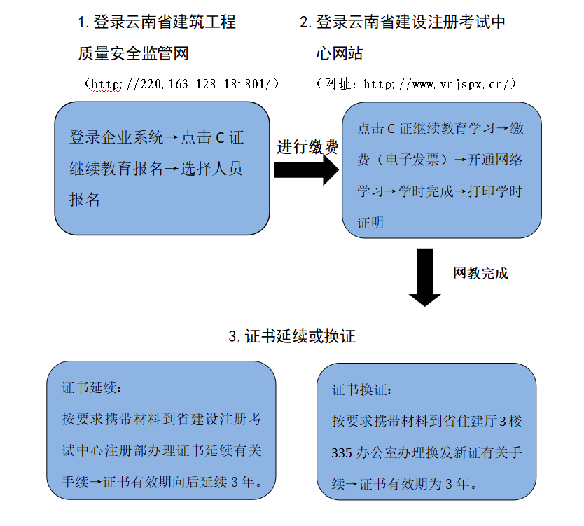 云南省建筑施工企業(yè)專職安全生產(chǎn)管理人員 (C證)繼續(xù)教育報名學(xué)習流程圖