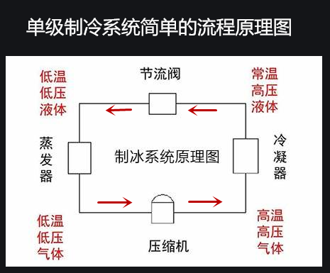 蒸汽壓縮式的冷庫制冷系統(tǒng)的流程原理,仍是大家熟悉的四大過程,即:壓縮——冷凝——節(jié)流——蒸發(fā)。相應的配套的主要設(shè)備是制冷壓縮機,冷凝器(風冷式或水冷式),節(jié)流閥(氟制冷系統(tǒng)為熱力膨脹閥),蒸發(fā)器(冷庫常用的為直冷排管和風冷式風機)。